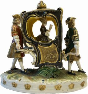 DONATORE ANONIMO Gruppo in porcellana policroma e dorata modellato in forma di portantina sormontata da corona [..]