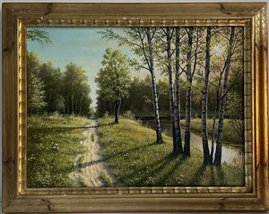 ANDREA E ANNALISA DEL RE A. Cepeopob Berep paesaggio fluviale, olio su tela entro cornice dorata, datato 2005, [..]