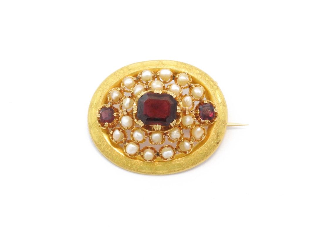 Yellow gold brooch with octagonal-cut and cushion-cut garnets and pearls, made within an oval gold frame entirely decorated by hand; bears hallmark of Perugia (Pontifical State), 4x3.4 cm, garnets approximately 6 ct in total, pearls 16.1 g