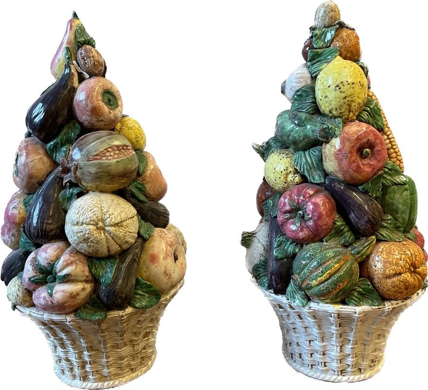DONATORE ANONIMO Coppia di grandi centro tavola piramidali in maiolica modellate in forma di cestine dipinte in bianco e trionfi di frutta e verdura in policromia, h cm 48, Ø cm 23