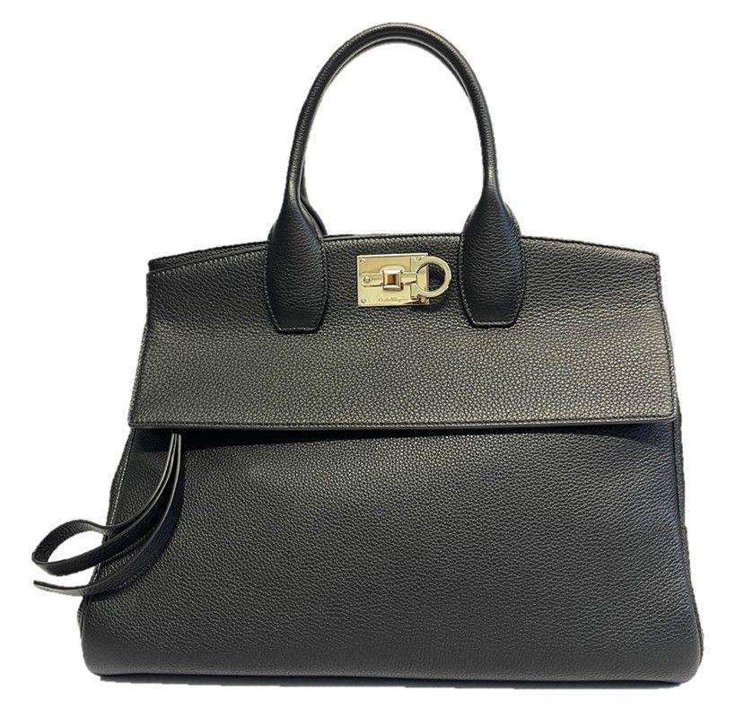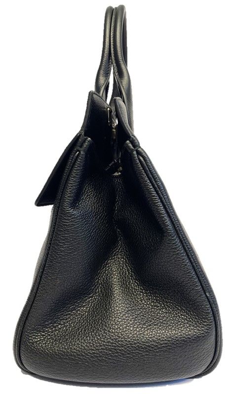 Borsa in pelle martellata colore nero con tracolla removibile e piedini con borchie, grande pochette interna estraibile con zip chiusra con Gancio in metallo dorato, h cm 29, lungh. cm 36 e profondità cm 18