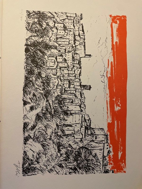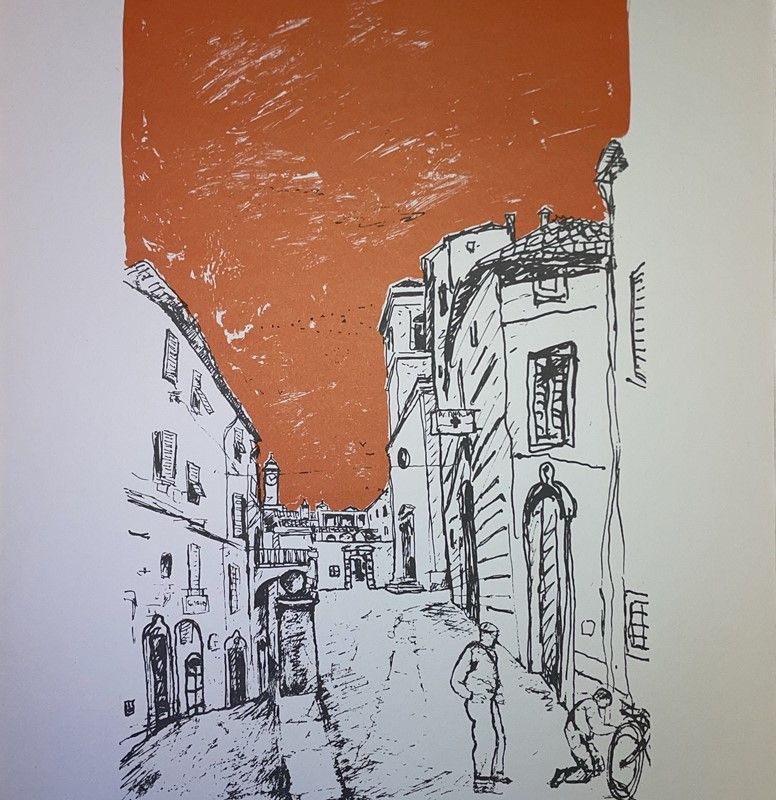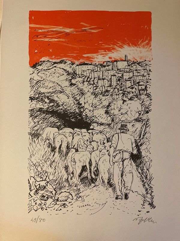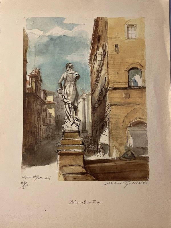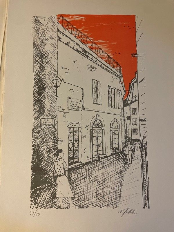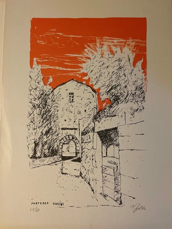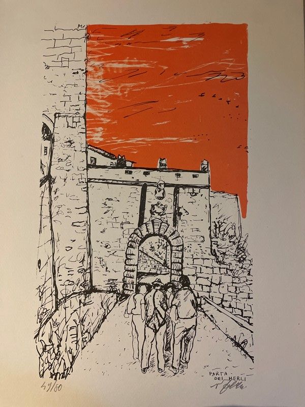 Lot consisting of 5 watercolor engravings depicting Monte Argentario by the painter Alfredo Fabbri; 11 original lithographs depicting Sorano by the painter Alfredo Fabbri and a photolithograph from the watercolor by Luciano Guarnieri depicting Palazzo Spini Feroni