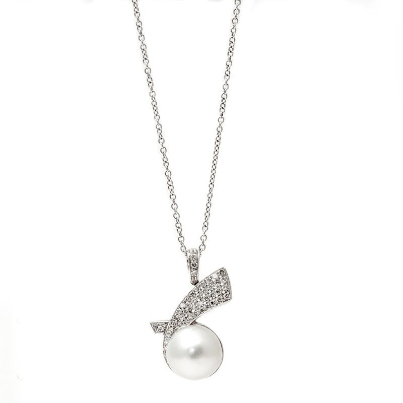 Pendente con perla australiana mm13 con pav? di diamanti taglio brillanti ct 0.72 con collanina in in oro bianco 750