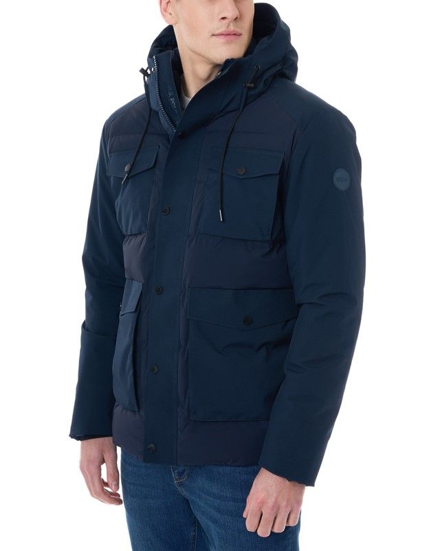 INCOM S.p.A. U.S. Polo Assn. Giubbotto blu navy con cappuccio in stretch nylon, trapuntato sul retro, arricchito da quattro tasche frontali e patch USPA su manica sinistra, chiusura centrale con zip e bottoni per un maggior riparo dal freddo, tg 52