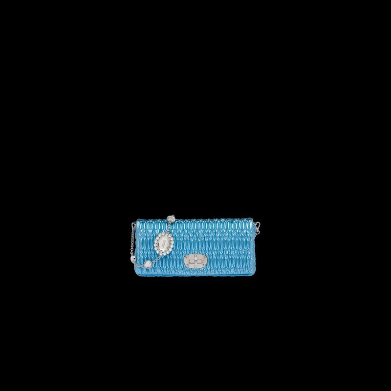 MIU MIU Nappa, lavorazione Cloqué, tracolla removibile in metallo con cristalli da 60 cm Chiusura girello con cristalli, interno in raso di cotone, tasca interna con zip. 3 cm x 28 cm x 14 cm