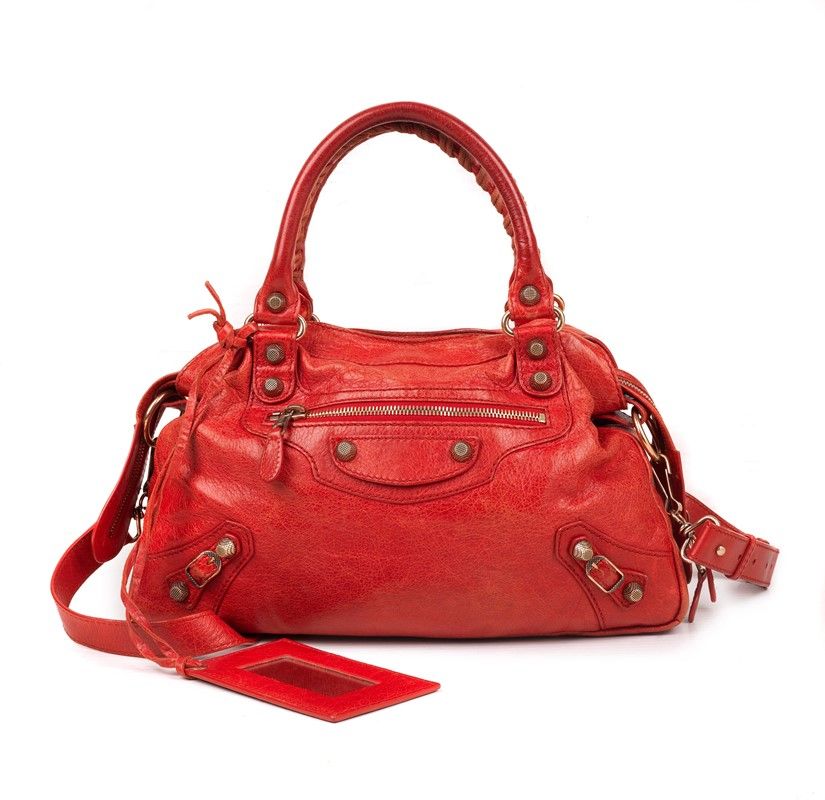 BALENCIAGA BORSA A MANO TOWN 12 Splendida Borsa City in pelle invecchiata rossa, inserti in metallo ottone invecchiato, doppio manico in pelle rossa da portare a mano o in tracolla grazie alla tracolla staccabile. Chiusura con zip. Una tasca con zip sul davanti della borsa. Fodera interna in tela nera, una tasca con zip. Corredata di specchietto originale. Dim. cm 33x22,5x7