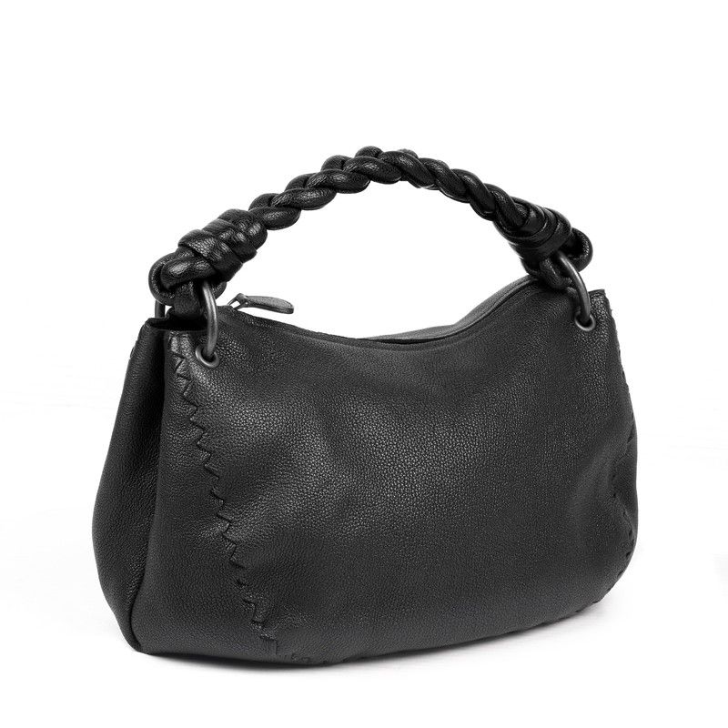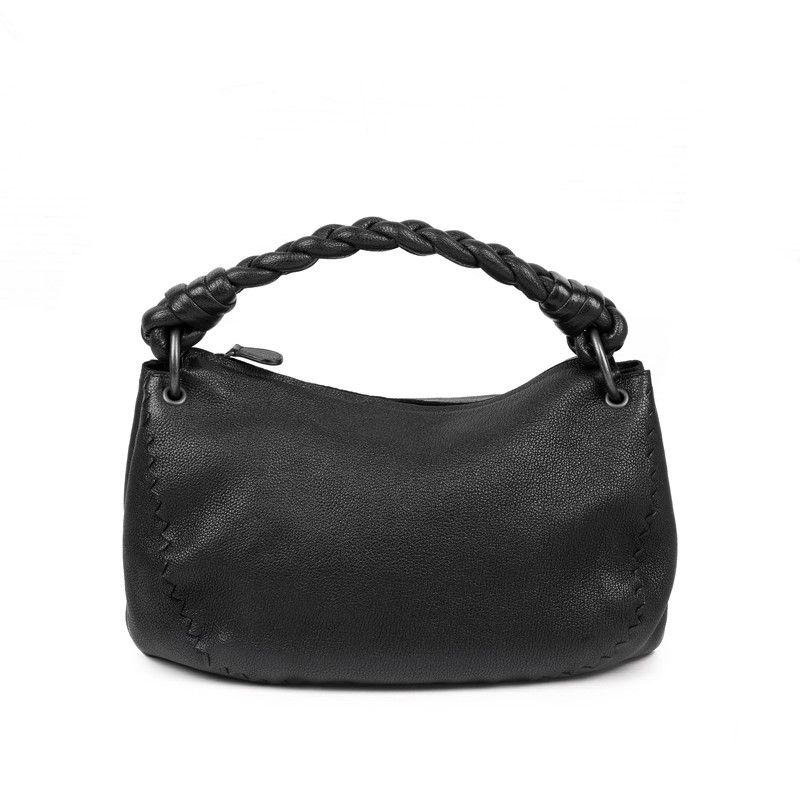 In una resistente pelle nera, con metalleria in color argento invecchiato. Particolare manico/tracolla a maxi intreccio. Dim.cm 31x20x13