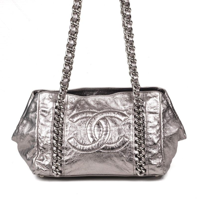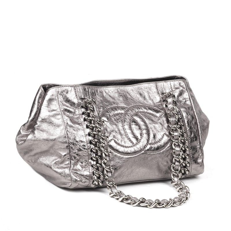 In pelle invecchiata argento con maxi logo CC a rilievo frontale e doppia maxi catena in metallo argentato e pelle intrecciata. Chiusra con calamita. Fodera in tessuto grigio con una tasca interna.