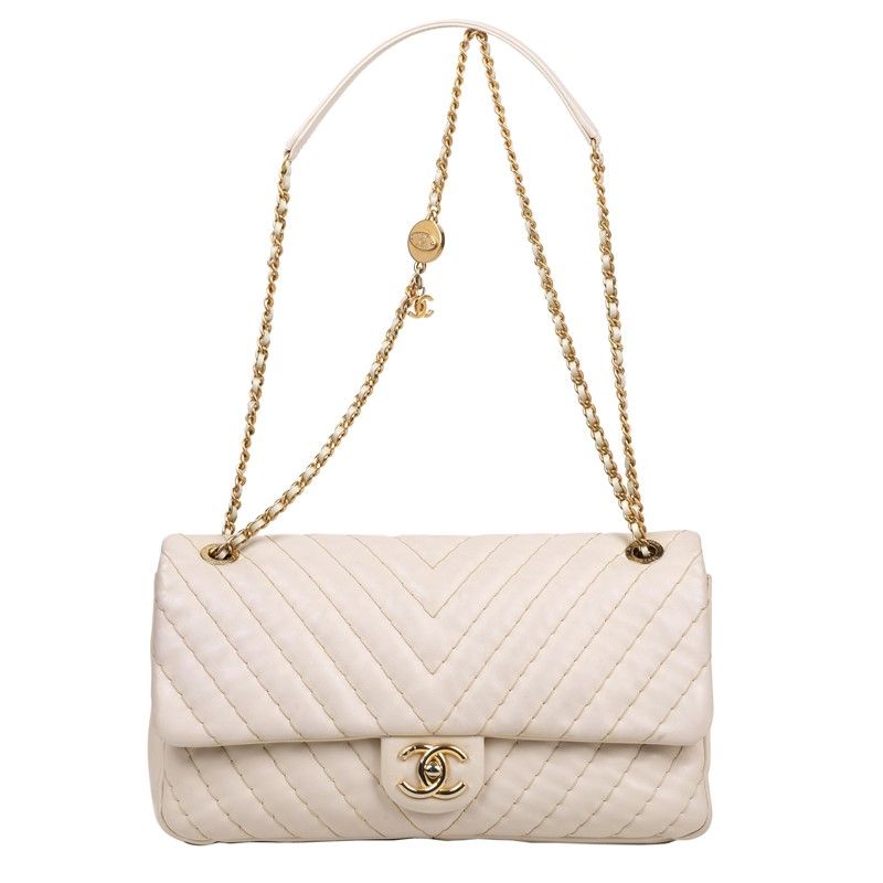CHANEL TRACOLLA Raffinata pelle con trapuntatura chevron in color panna, doppia tracolla scorrevole in catena ottone intrecciata con pelle e logo a pemdagliop su catena. Chiusra della pattina con doppia C; fodera tono su tono. Datata 2012 Dim. cm 32x18x7