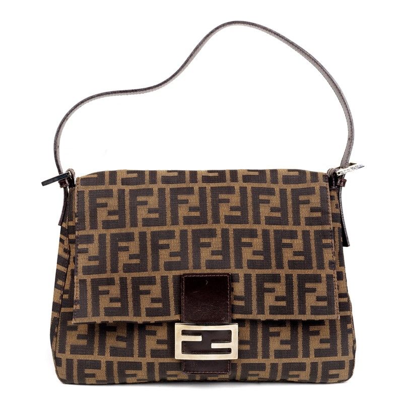 FENDI TRACOLLA MAMA FOREVER L’iconica it bag creata da Silvia Venturini Fendi nel 1997 e reinventata da allora in infinite espressioni della creatività Fendi, dalle paillettes al motivo FF. Qui in tela Zucca marrone e nera con chiusura logo in metallo color argento lucido. Dim. cm 28x23x2
