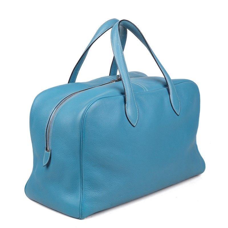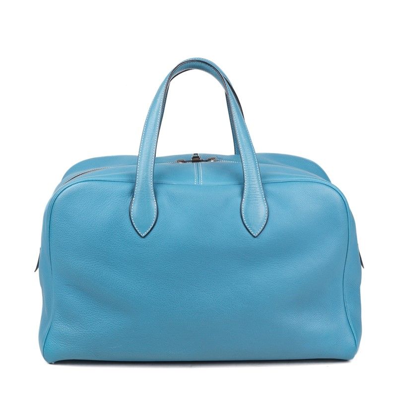 HERMES BORSA DA VIAGGIO VICTORIA II 40 Splendida borsa da viaggio Hermes Victoria II in pelle Clemence blu Paradise, inserti in palladio, impunture bianche, doppia tracolla in pelle blu da portare a mano. Una doppia chiusura lampo. Fodera interna in tela beige, una tasca applicata. Dim. cm 43x21x20