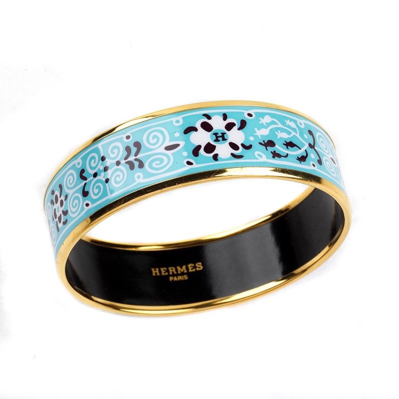 Con motivo floreale sui toni del turchese, bracciale rigido in ottone dorato e smalto. Diametro cm 7.