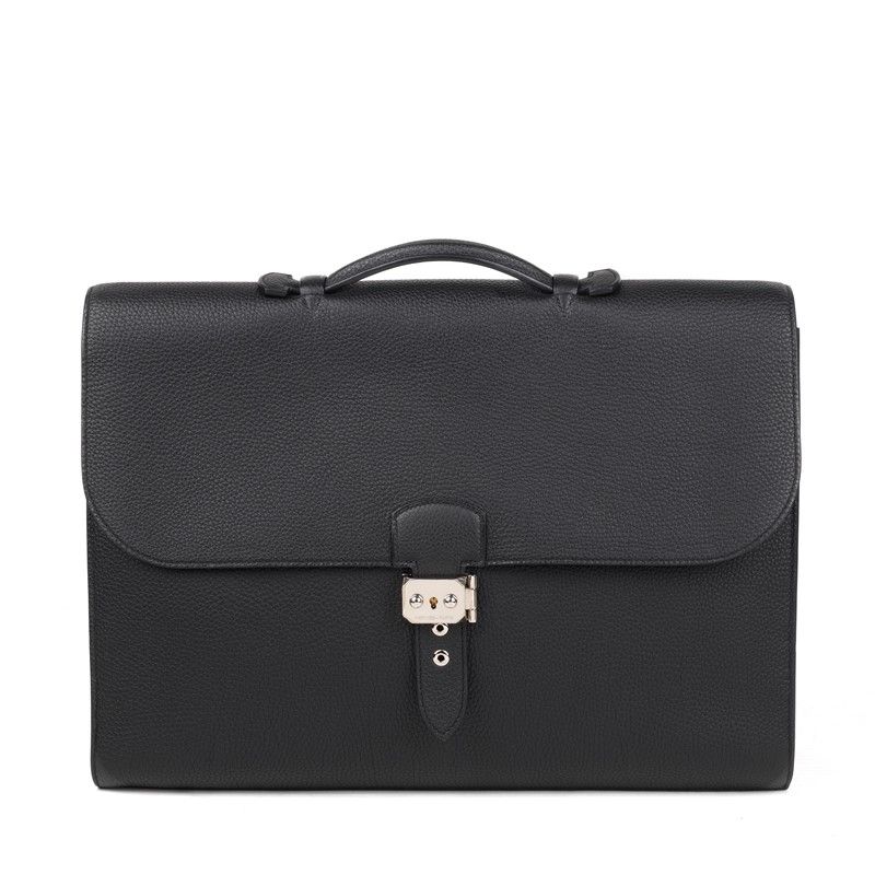 HERMES CARTELLA DA LAVORO SAC A DEPECHE 40 Elegante borsa portadocumenti Hermès Sac à dépêches in pelle Fjiord nera, inserti in palladio, impunture, manico semplice in pelle da portare a mano. Chiusura con chiavistello basculante sulla patta e fodera interna in pelle marrone, suddivisa in due scomparti a soffietto e una tasca. Corredata di dustbag e chiavi originali. Dim. cm 41x30x5