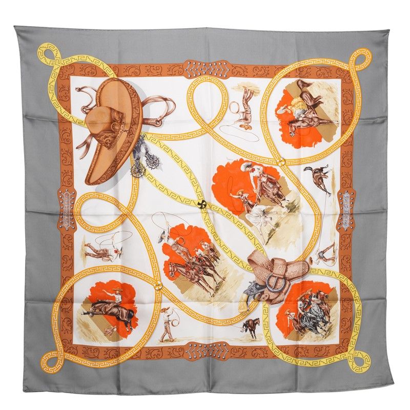 Disegnato da Jean de Fougerolle, in seta 100%, nei toni autunnalI dell'arancio, grigio, bianco e marrone Dim. cm 90x90