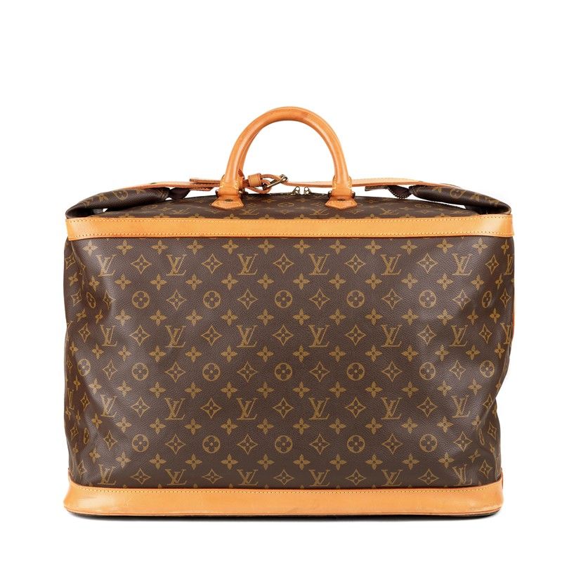 LOUIS VUITTON BORSA DA VIAGGIO CRUISER 50 La borsa a mano Cruiser con le sua linea elegante e in tela Monogram si chiude con una doppia cerniera e una cinghia in vacchetta naturale. Risale al 1993. In tela Monogram, finiture in vacchetta naturale, fodera in tela Parti metalliche in ottone dorato e cerniera a doppio cursore, cinturino in pelle con fibbia. Formato cabina. Dim. cm 50x34x25