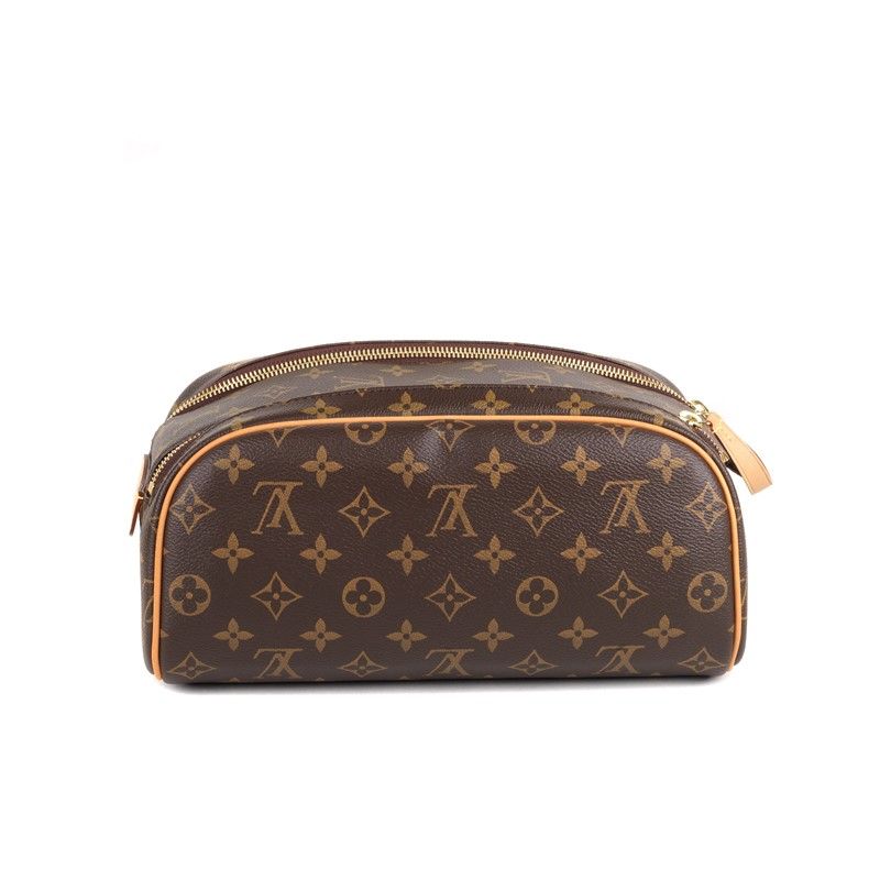 Da viaggio, in tela Monogram con rifiniture e laccetto tiralampo della doppia zip in vacchetta; metalleria in ottone.