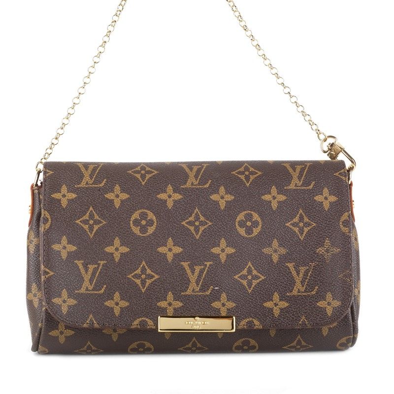 Piccola pochette in tela Monogram con chiusura frontale in ottone con logo e catena per portarla sotto spalla. Interno in tela di cotone marrone con picocla tasca.