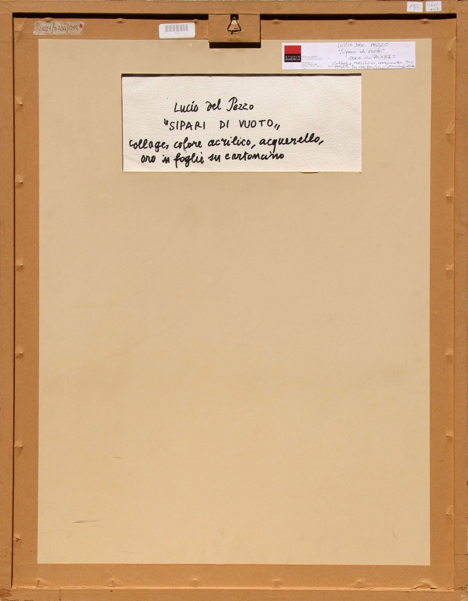 Firma, titolo, tecnica, misura Lucio del Pezzo, Sipari di vuoto, collage, colore acrilico, acquerello, oro in foglie su cartoncino, cm. 76x57,5;