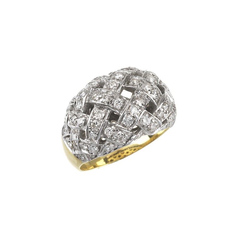 in oro giallo e bianco 18kt, realizzato seguendo un motivo a intreccio, impreziosito da diamanti taglio brillante per ct 2 circa, punzoni 750 e del fabbricante, mis. 18/58, gr. 11