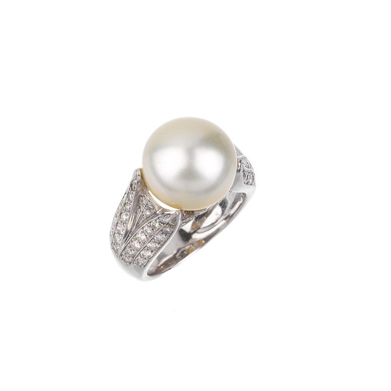in oro bianco 18kt, impreziosito al centro da una perla di mm 11 circa, affiancato da diamanti taglio brillante per ct 0.60 circa, punzone 750, mis. 8/48, gr. 9