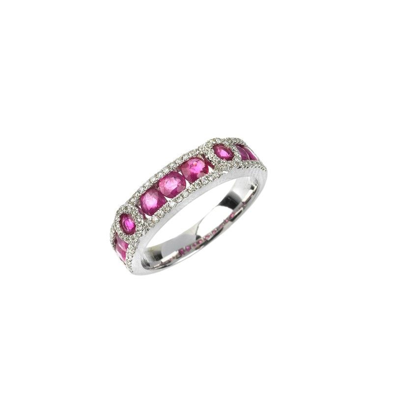 in oro bianco 18kt, impreziosito da rubini taglio rotondo per ct 1.40 circa e diamanti taglio brillante per ct 0.20 circa, punzone 750, mis. 14/54, gr. 4