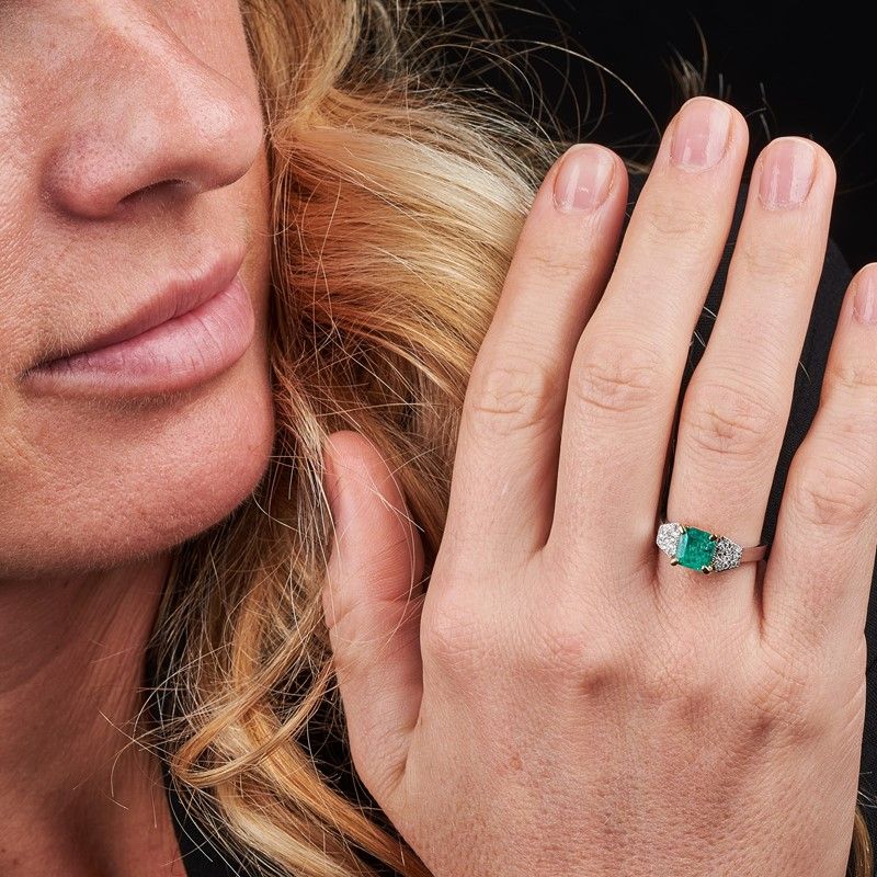 ANELLO CON SMERALDO E DIAMANTI in oro bianco e giallo 18kt, impreziosito al centro da uno smeraldo taglio ottagonale di ct 0.90 circa, affiancato da diamanti taglio brillante, punzoni 750 e del fabbricante, mis. 11/51, gr. 4