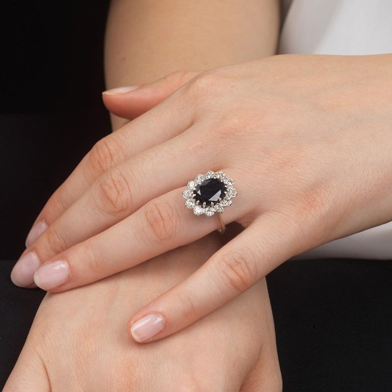 ANELLO FLOREALE CON ZAFFIRO E DIAMANTI in oro bianco 18kt, impreziosito al centro da uno zaffiro taglio ovale di ct 3.60 circa, circondato da diamanti taglio brillante per ct 1.20 circa, mis. 14/54, gr. 5