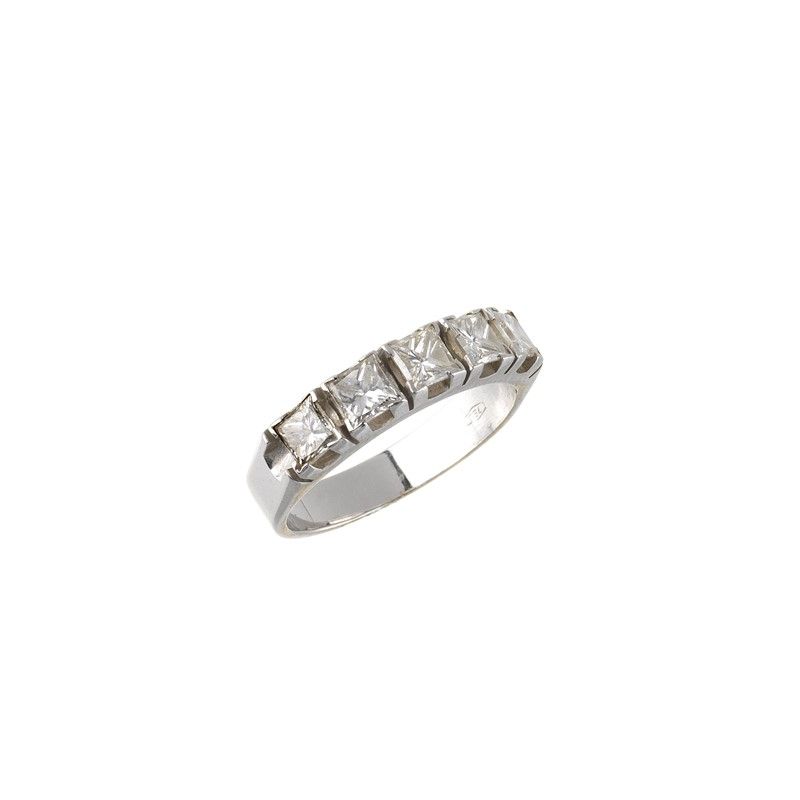 in oro bianco 18kt, impreziosito da cinque diamanti taglio princess per ct 1.20 circa, punzone 750, mis. 17/57, gr. 4