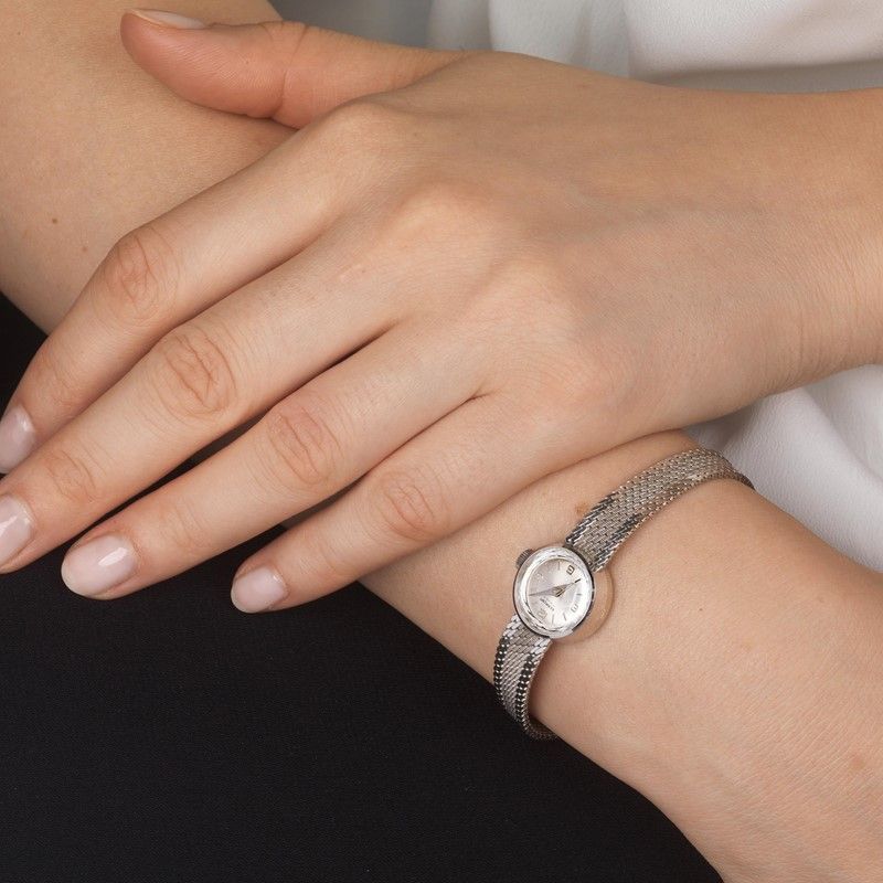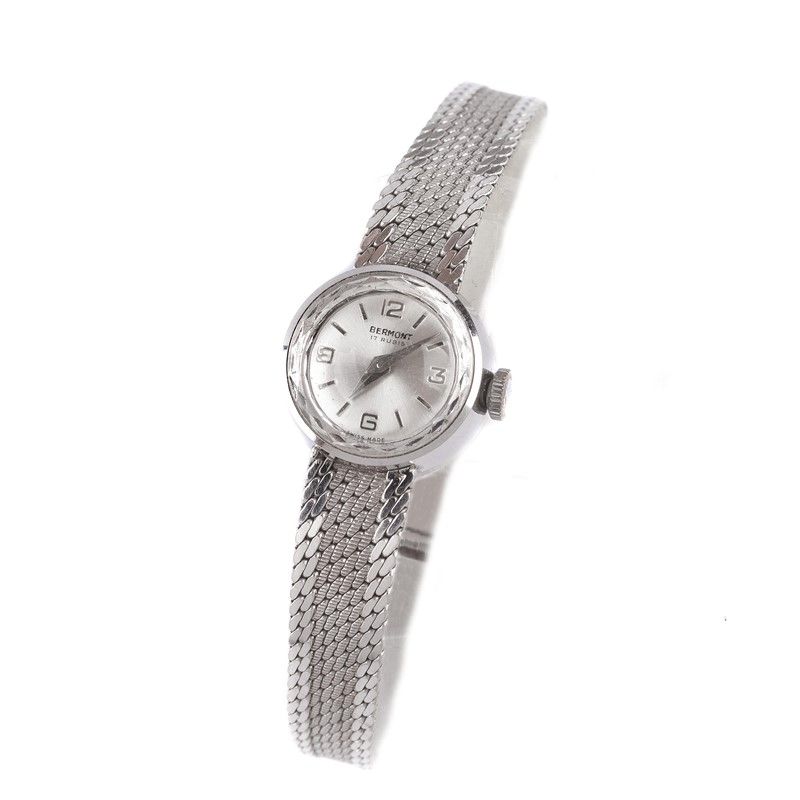 BERMONT OROLOGIO DA DONNA cassa in oro bianco 18kt, fondello a pressione, quadrante argenté, indici e numeri arabi applicati, movimento a carica manuale, bracciale a maglia tessita con chiusura a scomparsa in oro bianco 18kt, vetro minerale, gr. 20. Diam. mm 16 Orologio non funzionante.