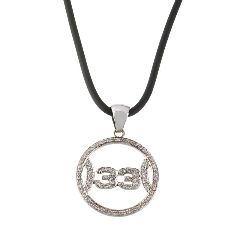 composta da cordoncino in caucciù e pendente impreziosito da diamanti taglio brillante per ct 0.60 circa, dim. pendente cm 2,5x4 circa, lungh. cm 53,5, gr. 12