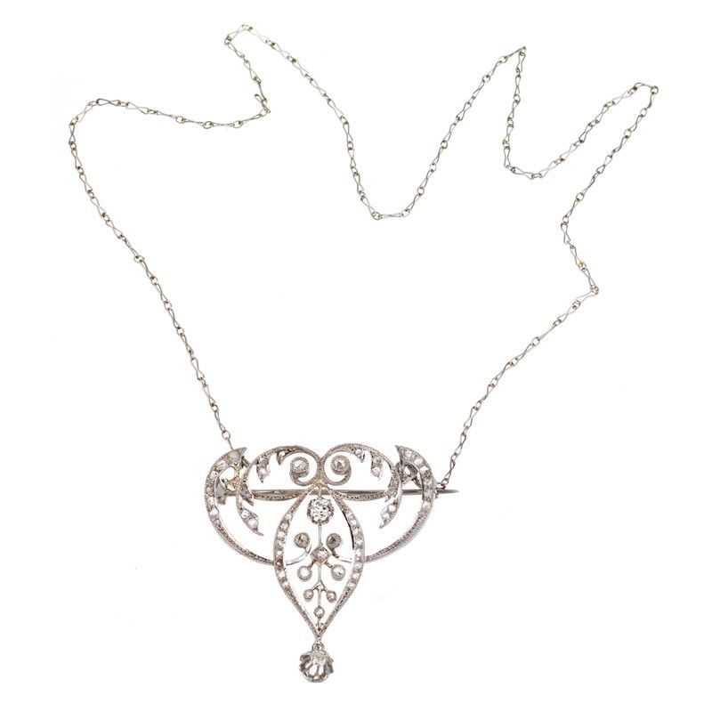 in oro bianco 18kt, composta da catena removibile e spilla, impreziosita da diamanti taglio veccho e a rosa per ct 0.25 circa, dim. cm 4x4 circa, lungh, cm 43, gr. 10