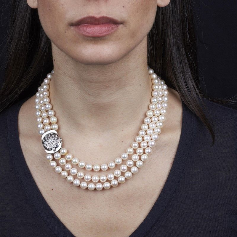 composta da tre fili di perle di mm 7 circa, fermatura in oro bianco 18kt impreziosita da diamanti taglio brillante per ct 0.20 circa, punzoni 750 e del fabbricante, lungh. cm 44, gr. 130