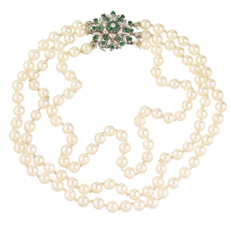 a tre fili di perle di mm 6 circa, fermatura in oro bianco 18kt impreziosita da smeraldi taglio rotondo per ct 1.70 circa e diamanti taglio brillante e huit huit per ct 0.20 circa, punzone 750, lungh. cm 36, gr. 36