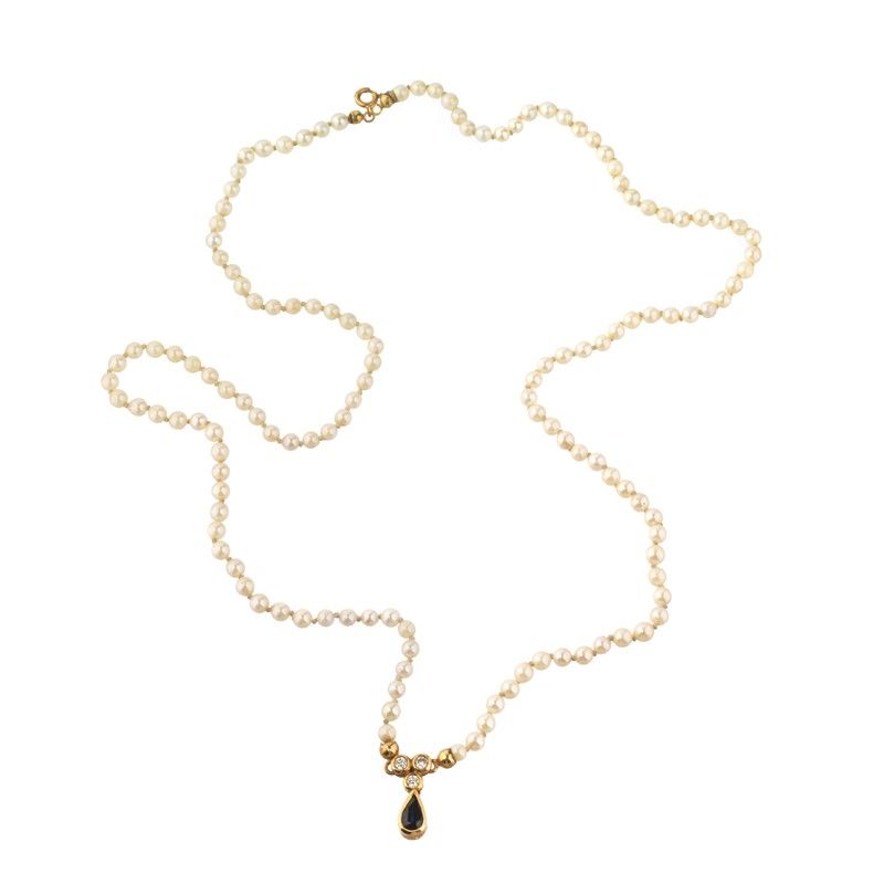 ad un filo di perle di mm 3 circa, pendente e fermatura in oro giallo 18kt, impreziosita da uno zaffiro taglio a goccia di ct 0.50 circa e tre diamanti taglio brillante per ct 0.20 circa, punzone 750, lungh. cm 58, gr. 12