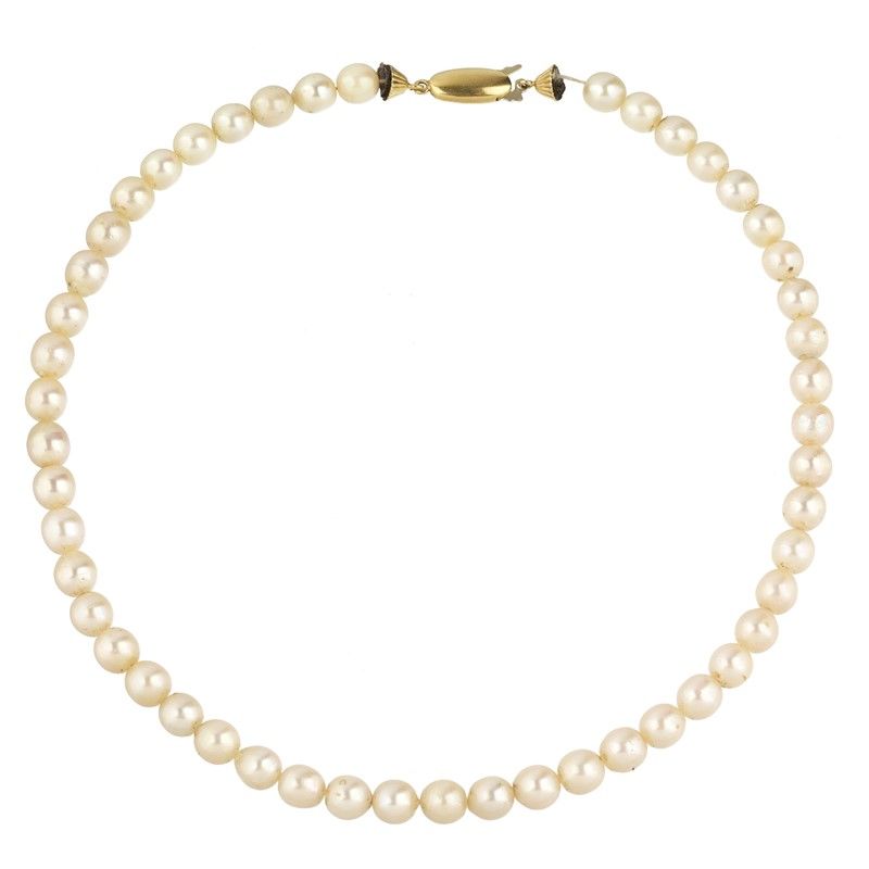 ad un filo di perle di mm 7 circa, fermatura in oro giallo 18kt, punzone 750, lungh. cm 43,5, gr. 37