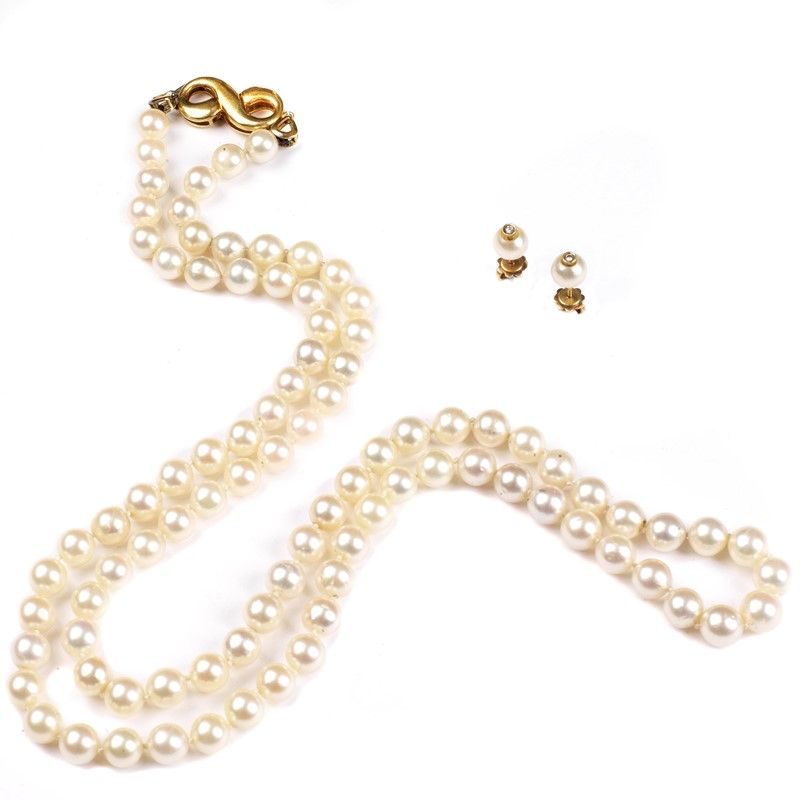DEMI PARURE CON PERLE composta da una collana ad un filo di perle di mm 8 circa, con fermatura in oro giallo e bianco 18kt, e paio di orecchini con perle di mm 7 circa e due diamanti taglio brillante, chiusura a farfallina, punzoni 750 e del fabbricante, lungh. cm 85, gr. 78
