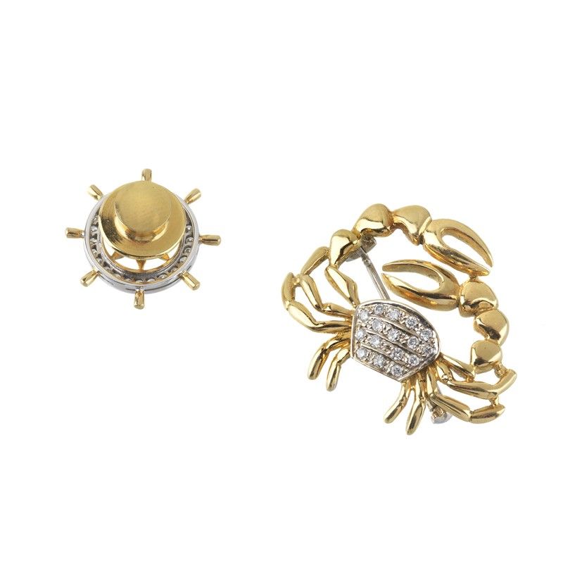 DUE SPILLE A TEMA MARINO in oro giallo e bianco 18kt, una spilla a forma di granchio di dim. cm 3x2,5, accompagnata da un secondo spillo a forma di timone di cm 2x2 circa, impreziosite da diamanti taglio brillante per ct 0.40 circa, punzoni 750 e del fabbricante, gr. 13 complessivi