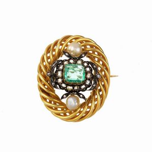 SPILLA A SPIRALE CON SMERALDO PERLE E DIAMANTI in oro e argento, al centro di un motivo a tralci uno smeraldo [..]