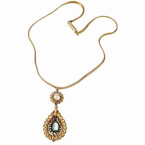 COLLANA PENDENTE CON SMERALDO PERLA E DIAMANTI in oro a basso titolo e argento, pendente a forma di goccia impreziosito [..]