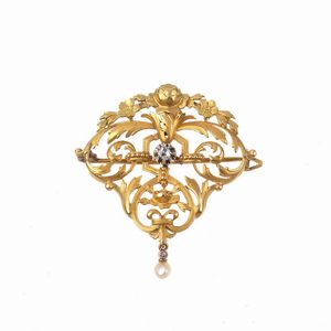 SPILLA A TRALCI in oro giallo 18kt, con al centro una rosa di diamante, punzone francese e 750, dim. cm 3,5x4, [..]