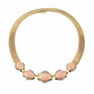COLLANA TUBOGAS CON CORALLI ROSA E DIAMANTI in oro giallo 18kt, impreziosita da cinque coralli rosa taglio cabochon [..]