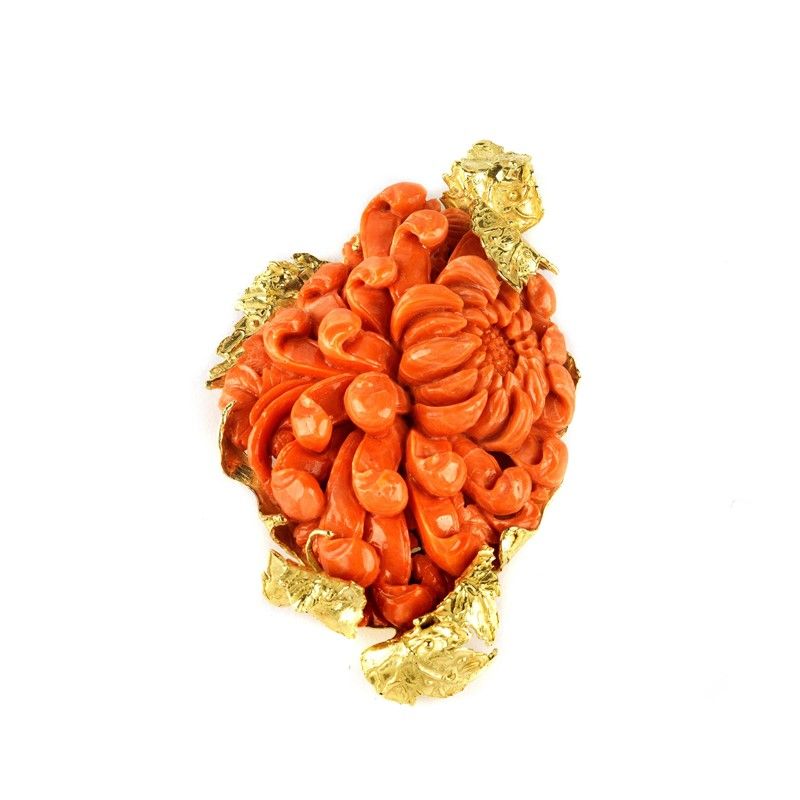 in oro giallo 18kt e corallo inciso raffigurante un grande fiore, dim. cm 5,5x9 circa, gr. 85