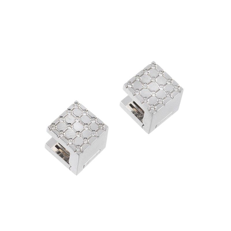in oro bianco 18kt, realizzati a forma quadrata, impreziositi da diamanti taglio brillante per ct 0.30 circa, firmati Leaderline, punzoni 750 e del fabbricante, dim. cm 1x1x1 circa, gr. 16 complessivi