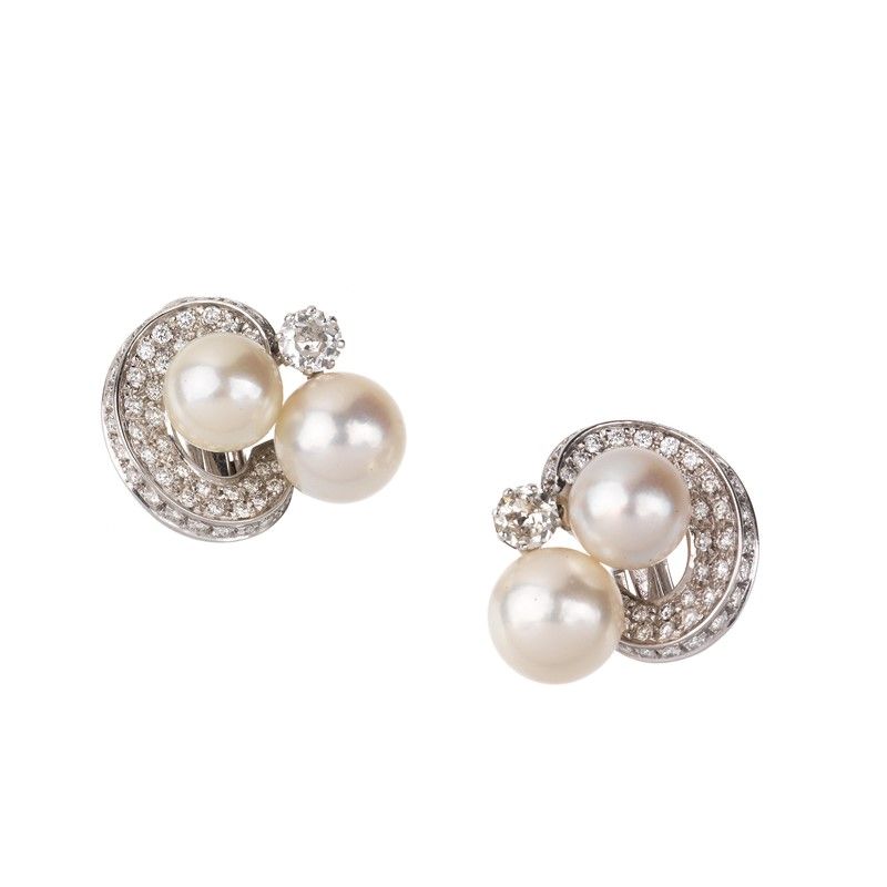 PAIO DI ORECCHINI CON PERLE E DIAMANTI in oro bianco 18kt, impreziositi da perle di mm 9 e mm 8 circa, pavé di diamanti taglio brillante per ct 1.60 circa, chiusura a clip con perno, punzoni 750 e del fabbricate, dim. cm 2x2 circa, gr. 15 complessivi