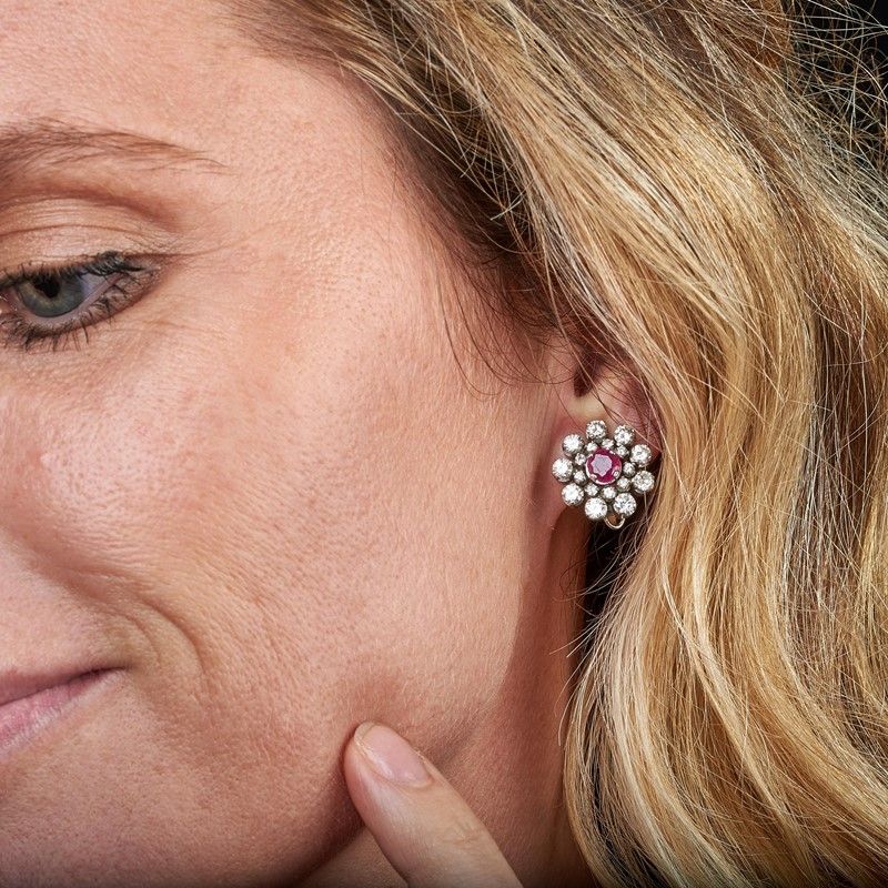 PAIO DI ORECCHINI FLOREALI CON RUBINI E DIAMANTI in oro bianco 18kt, impreziositi al centro da due rubini taglio rotondo per ct 1 circa, circondati da diamanti taglio brillante per ct 3 circa, chiusura a clip, dim. cm 1,5x1,5, gr. 10 complessivi. Corredati di blister SGR attestante le caratteristiche.