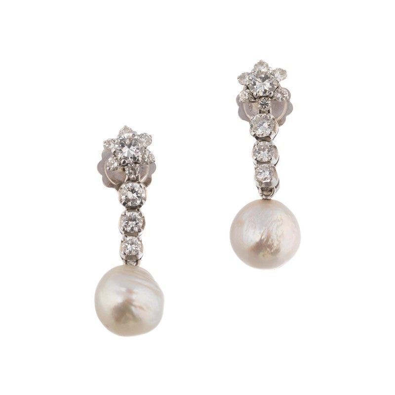 PAIO DI ORECCHINI PENDENTI CON PERLE E DIAMANTI in oro bianco 18kt, impreziositi da perle di mm 11 circa e diamanti taglio brillante per ct 2.70 circa, chiusura a clip, punzoni 750 e del fabbricante, lungh. cm 3, gr. 10 complessivi