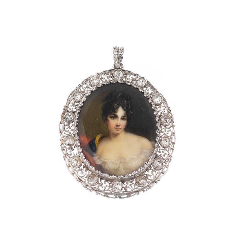 in oro bianco 18kt, di forma ovale, al centro una miniatura con il ritrato del busto di una donna cinta da ghirlanda e diamanti taglio vecchio per ct 1.40 circa, dim. cm 3,5x4 circa, gr. 8