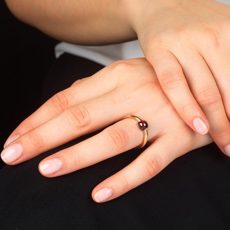in oro giallo 18kt, con al centro un granato taglio cabochon, firmato "Pomellato", punzoni 750 e del fabbricante, mis. 17/57, gr. 3