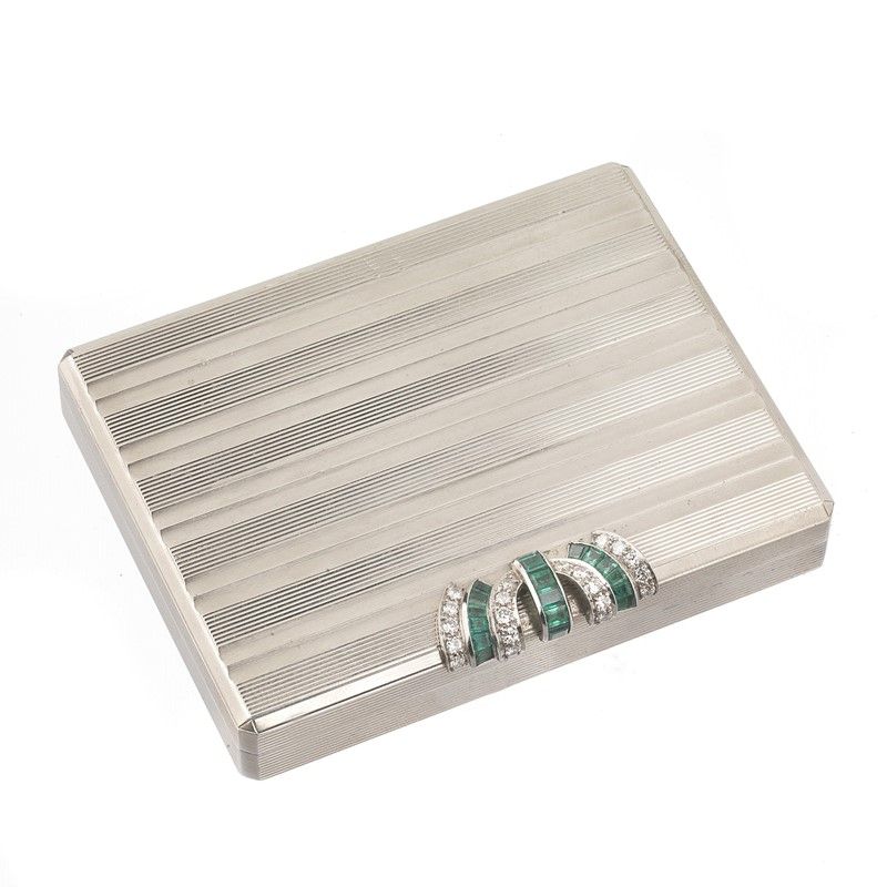 PORTACIPRIA CON SMERALDI E DIAMANTI in argento inciso a mille righe, chiusura in oro bianco 18kt impreziosita da smeraldi taglio ottagonale e tapes per ct 1.70 circa e diamanti taglio brillante per ct 1 circa, punzoni C.I.F. e del fascio, n. seriale 04909, con due scompartimenti interni, corredata di due specchi e retino, dim. cm 9x7x1,5 circa, gr. 244