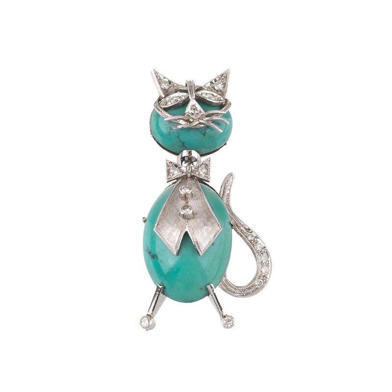 CAT-SHAPED TURQUOISE AND DIAMOND BROOCH IN 18KT WHITE GOLD